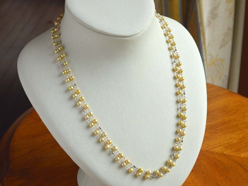 イエローベージュ系のの淡水パールとシルバーカラーパーツをピンでつなぎ合わせてロングタイプのネックレスに仕上げました。