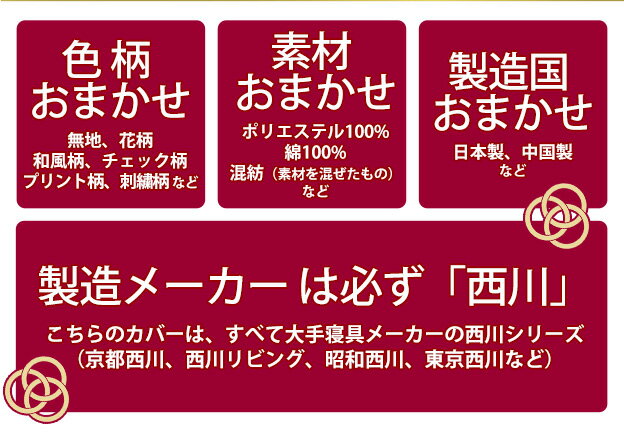 (※京都西川、昭和西川、西川リビング、東京西川など) 色、柄、素材はすべて【当店おまかせ】商品です。