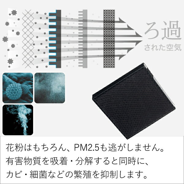 新型光触媒の光ブルー活性炭フィルターで有害物質を吸着・分解すると同時に、銀イオン抗菌 HEPAタイプフィルターによってウィルス・カビ・細菌などの繁殖を抑制します。